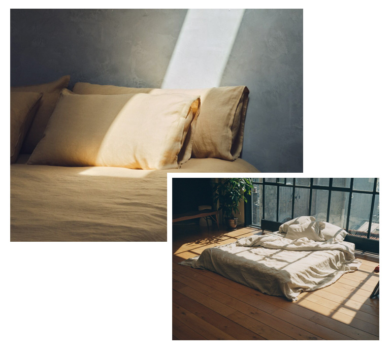 Choose bed linen made from silky sateen, or soft linen and luxuriously fluffy pillows and duvets.